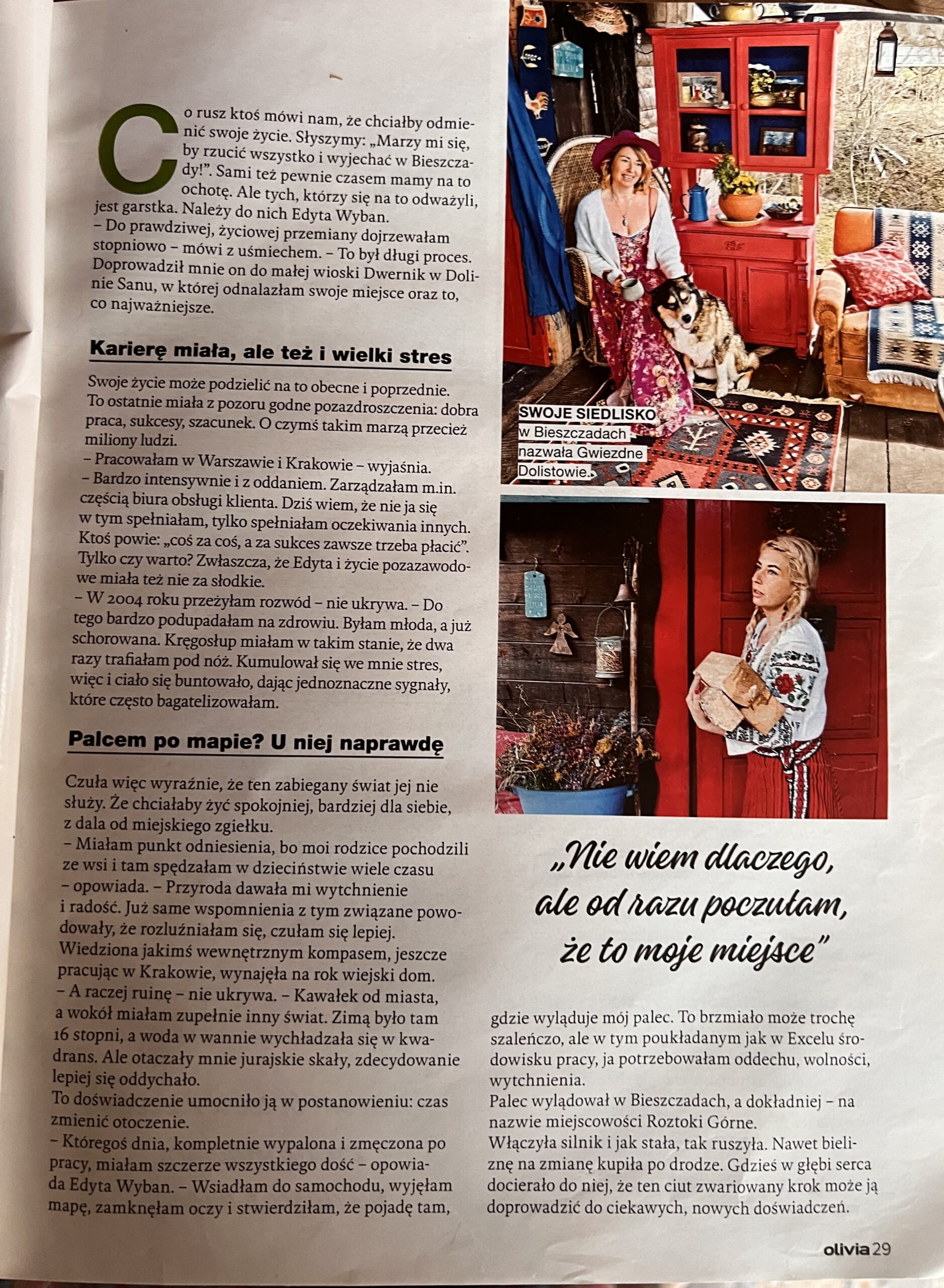 - Chcę służyć sobie i innym (pomagając odkryć swą wewnętrzną moc) jak najlepiej potrafię (Yoga, gimnastyka słowiańska, pobyt w przyrodzie, sesje relaksacyjne dźwiękowe, warsztaty, inspiracje na blogu), medytacje, afirmacje. A to wszystko w malowniczych Bieszczadach w moim „Gwiezdnym Dolistowiu” oraz online. Zapraszam do swojego świata.