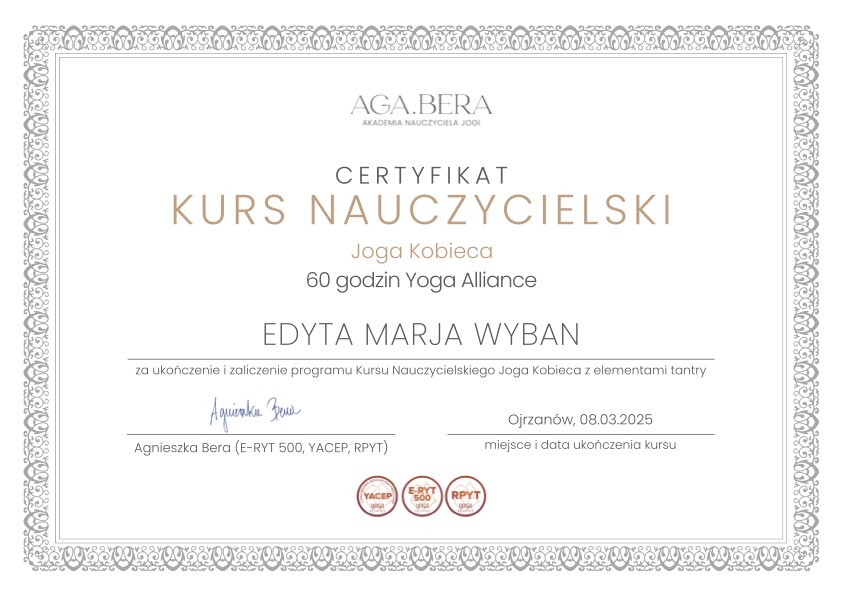 W wieku 16 lat zetknęłam się z yogą po raz pierwszy.  Dosłownie uratowała moje zdrowie. Wraz z odzyskanym zdrowiem porzuciłam ją na długie lata. Od 2022 r. praktykuję niemal codziennie yogę kundalini. Od 2025 dołączyła do moich pasji medytacyjna yoga yin oraz nidra. Ta pierwsza stała się elementem mojego duchowego rozwoju i narzędziem do odnajdywania SPokoju. Poza tym co robię na macie przekłada się na moje codzienne życie i za to kocham yogę najbardziej na świecie. Nie chodzi o zgrabnie wykonane asany, energetyczne mudry czy śpiewanie mantr ale o esencję Prawdy w realnym życiu i to jakim człowiekiem staję się dzięki praktyce. W mym życiu jest więcej przestrzeni, spokoju, cichej radości, zrozumienia, akceptacji, zaufania. Jestem bliżej Życia, niż kiedykolwiek wcześniej i to chcę pokazać również Wam jako nauczycielka.