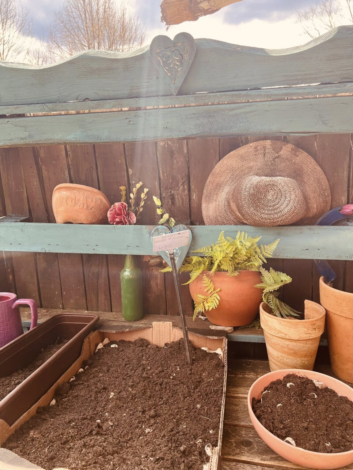 Mój prywatny ogrodniczy, kącik, w którym mogę się skryć przed światem i siać nasionka, przesadzać kwiaty, przekopywać, „okopywać siebie”, podziwiać wzrost maleńkich , zielonych roślinek. Buduję go pomalutku w tym samym powolnym tempie jakim nadchodzi wiosna , cały czas jakby nie gotowa na rozkwit. Czy macie też takie swoje prywatne przestrzenie w mieszkaniu albo na podwórku gdzie lubicie się schować przed bliskimi lub dalekimi tak aby po powrocie móc cieszyć się bardziej relacjami i kontaktem z innymi? Kiedyś moja znajoma zmęczona trudną stroną macierzyństwa chowała się na 5, 10 min w schowku na szczotki, zamykała się tam, płakała albo krzyczała a potem wracała do kuchni i do córeczki czując się na chwilę odświeżona, obmyta łzami i choć trochę dająca sobie czas tylko dla siebie choć nie bez poczucia winy ale nadal z miłością…. Ja mam kilka takich miejsc w lesie a teraz mój „ ogrodniczy” będzie pełnił trochę taką funkcję ucieczkową od życia aby do codzienności powracać z nową siłą i energią wziętą od ziół, kwiatów. Pięknej niedzieli dla Was
