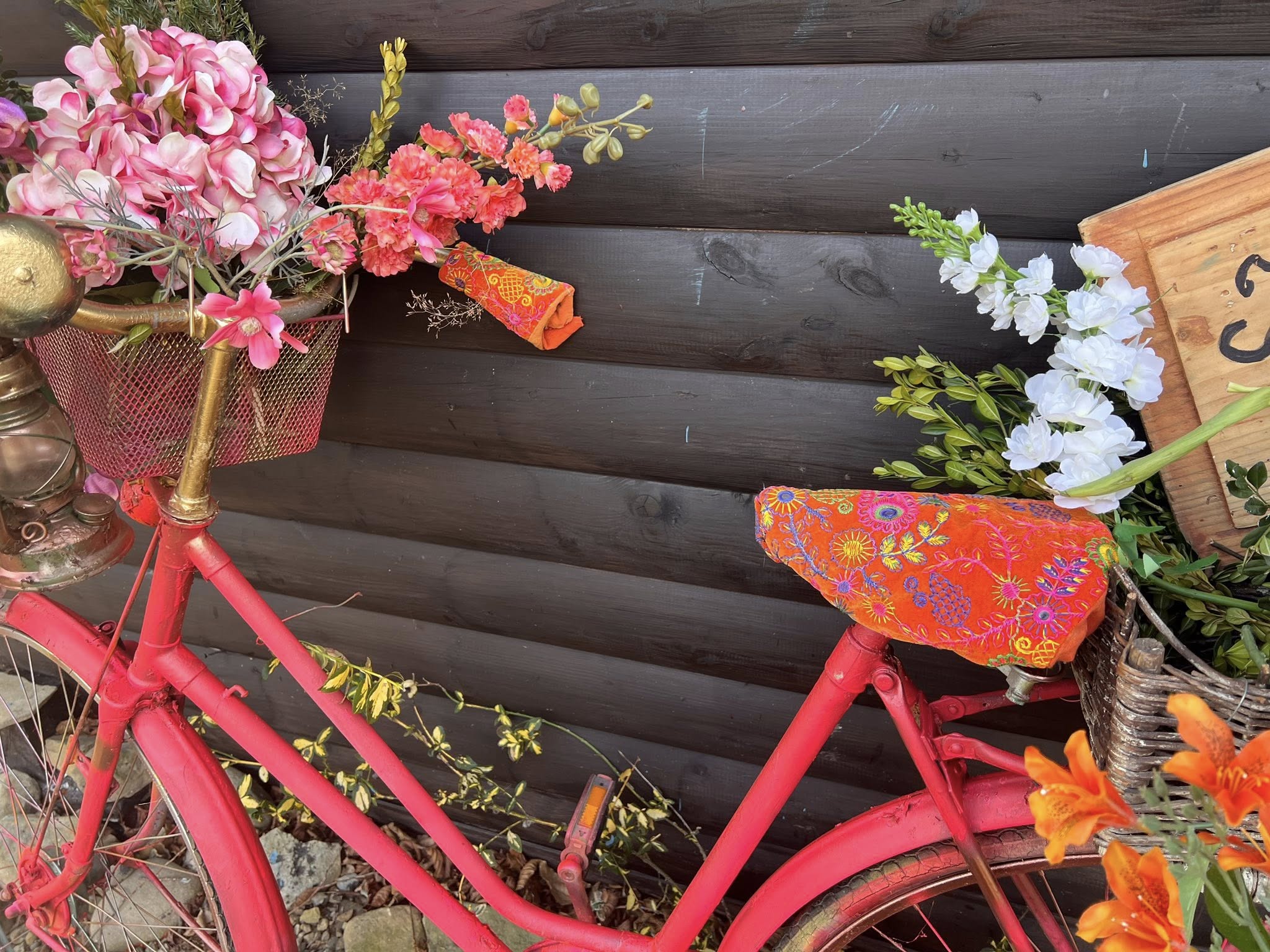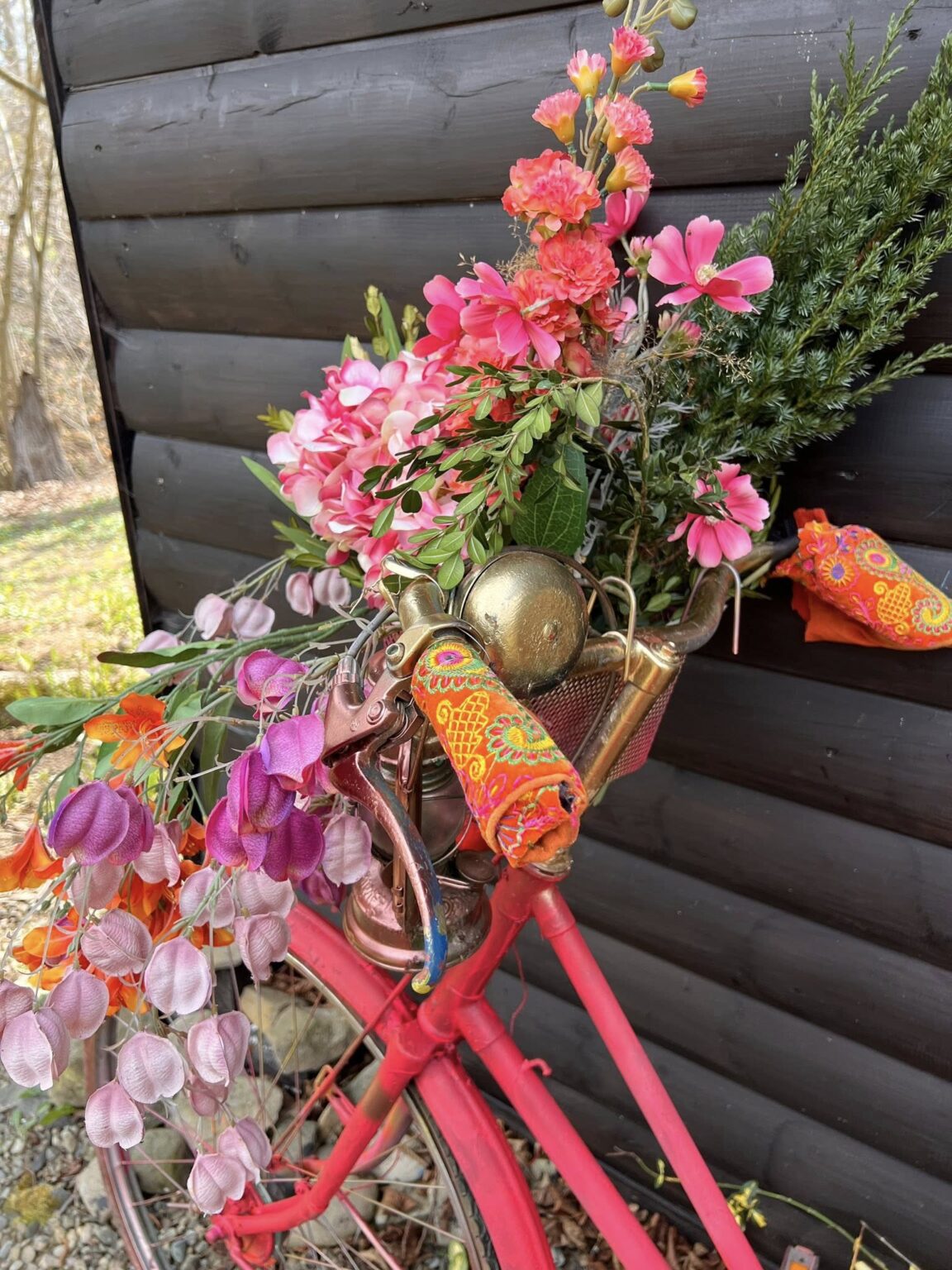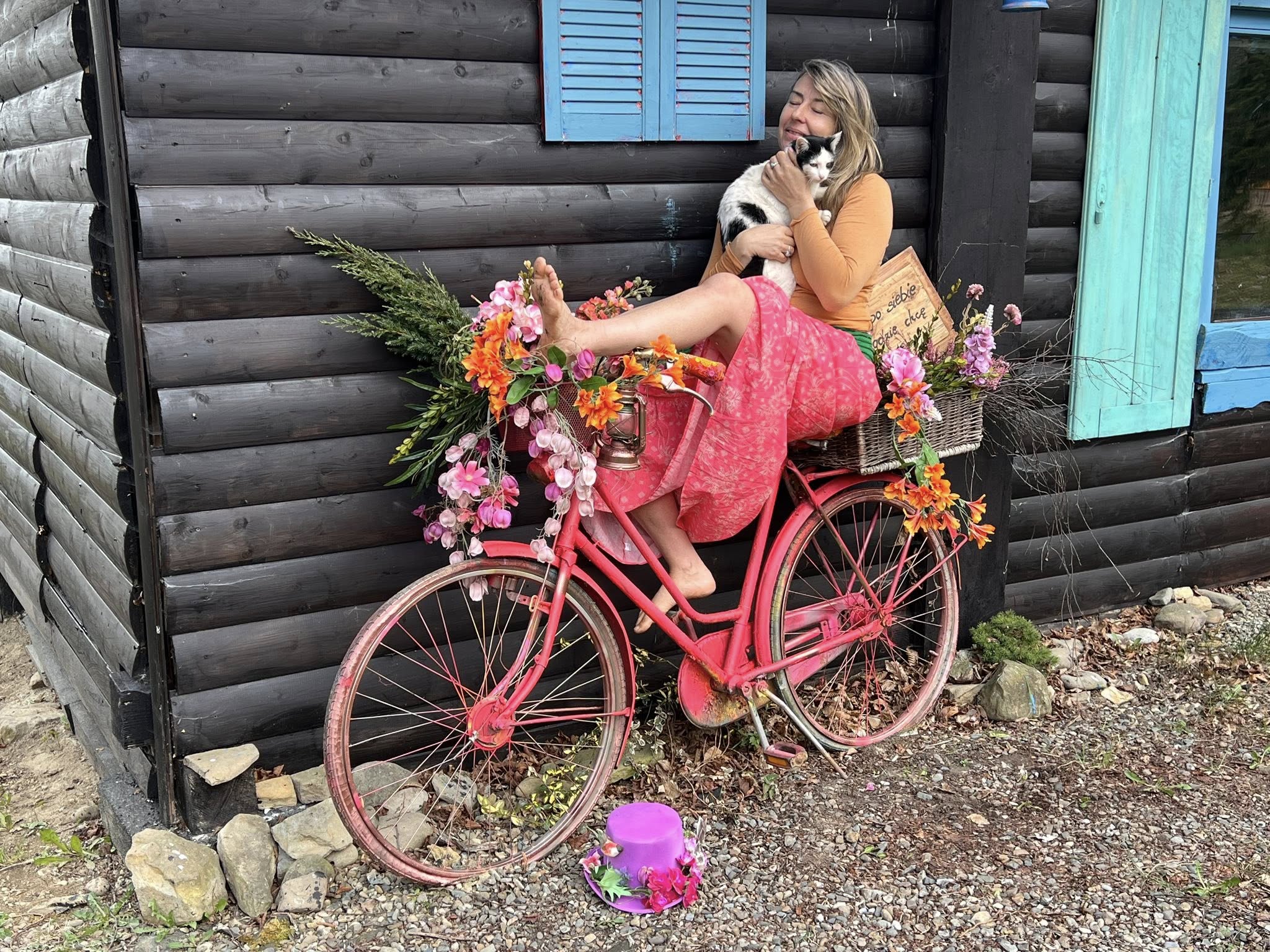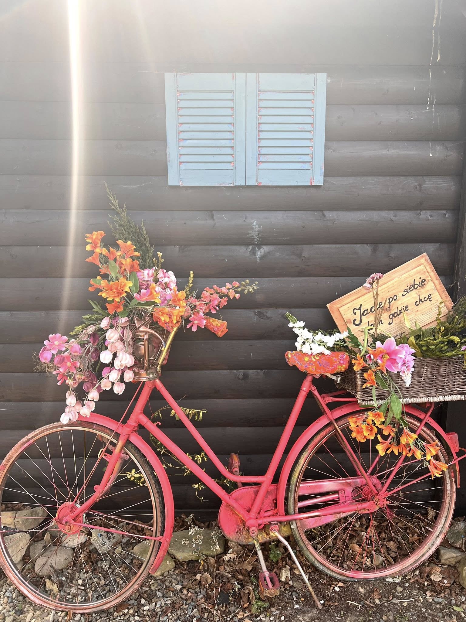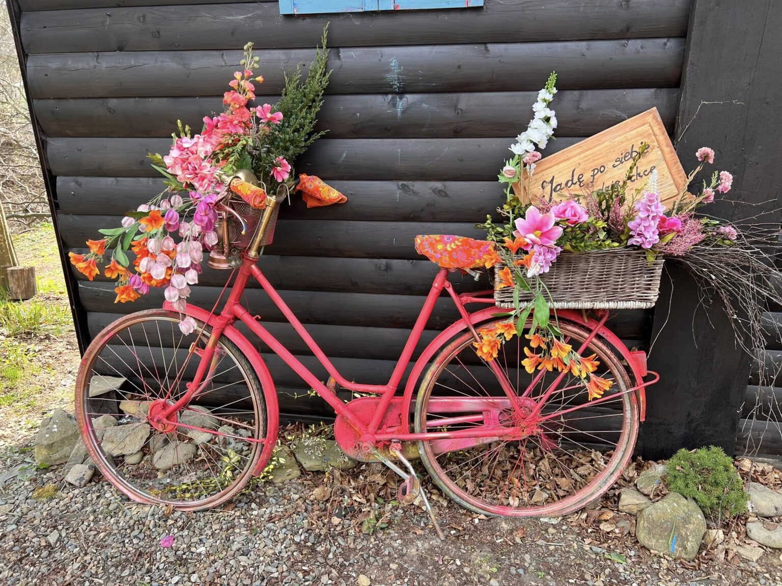 Będzie artykuł ale tymczasem kilka zdjęć. Na nich moja coroczna instalacja rowerowa. Rower numer jeden w tym roku wylosował kolor intensywnie różowy. Nie mogąc się doczekać kwiatów odważnie sięgnęłam po kiczowate i niestety nieekologiczne sztuczne kwiaty.